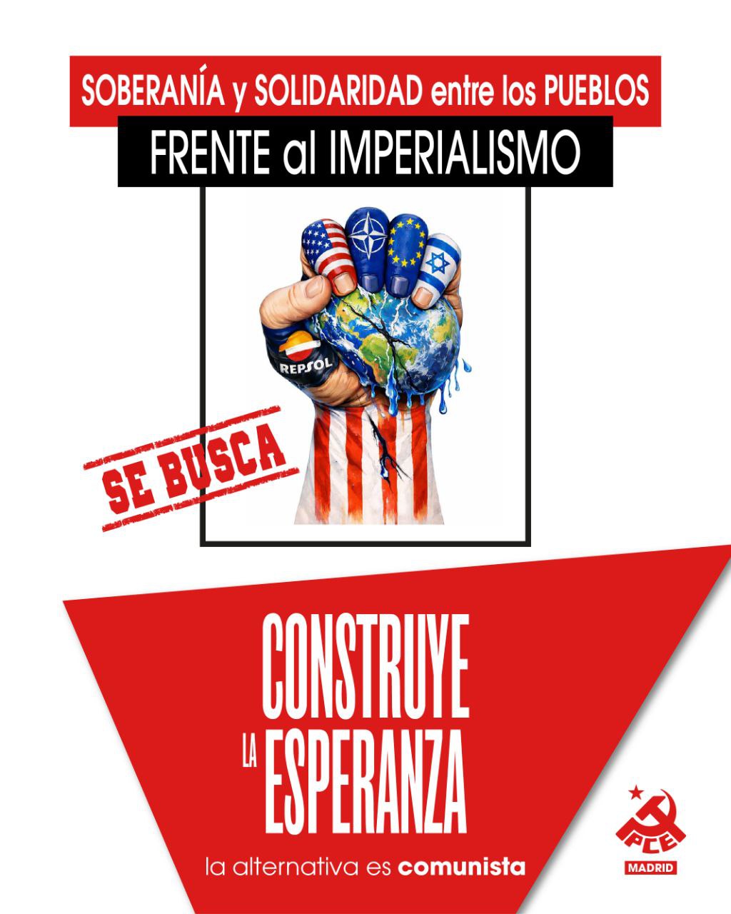 La concentración de la riqueza que genera la clase trabajadora en manos de unos pocos. El papel cada vez más fuerte de las finanzas y los bancos. El robo de recursos y la explotación que ejercen las empresas en todo el mundo. La guerra como forma de dirimir disputas económicas, para controlar los recursos y machacar a los pueblos que luchan por su liberación. El avance de posiciones reaccionarias, racistas y machistas. La constante destrucción de la naturaleza. La desposesión de todo lo que generamos como clase trabajadora. Estas son las características del imperialismo, que actúan simultáneamente y que impiden a la clase trabajadora avanzar en todo el planeta. Y por eso desde el PCE nos movilizamos y trabajamos para combatir al imperialismo, para construir la esperanza. Hay un hilo conductor entre lo que sucede en Madrid y en nuestro país con la situación en el resto del mundo. Cuando se fortalecen aquí los negocios bélicos, que expolian los recursos naturales soberanos y destruyen la naturaleza, mayor sufrimiento se genera en los pueblos del planeta y en la clase trabajadora global. El imperialismo no es algo ajeno a la Comunidad de Madrid, sino que define buena parte del poder económico y político que perjudica tanto a la clase trabajadora que vive aquí, como a la que sobrevive y lucha en todo el planeta. España y Madrid forman parte del bloque imperialista constituido en torno a la OTAN y la UE. Aquí se asienta y crece el poder de una burguesía con fuertes vínculos políticos, económicos y financieros con los centros del poder global, especialmente de América Latina y concretamente de Venezuela, que apoya la violación de todos los derechos con tal de volver a controlar los recursos que pertenecen al pueblo venezolano. Los intereses de la burguesía que reside en Madrid y en el Estado son los mismos que los del bloque imperialista, y son los que explican la agresión a países que buscan su propio camino de liberación. Venezuela, pero también Cuba, el Sáhara Occidental y, sin duda, Palestina, son sólo los conflictos armados más conocidos que genera el imperialismo, pero no son los únicos, porque la guerra se extiende por todo el planeta, excepto -precisamente- en el bloque imperialista.